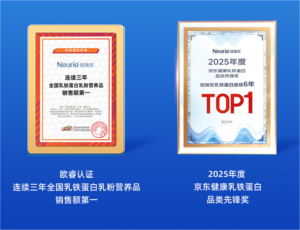 紐瑞優(yōu)在此次大會中備受矚目,作為乳鐵蛋白先行品牌,紐瑞優(yōu)憑借卓越的品質(zhì)和不懈的創(chuàng)新精神,今年榮獲了歐睿認證“連續(xù)三年全國乳鐵蛋白乳粉營養(yǎng)品銷售額第一”和“2025年京東平臺乳鐵蛋白品類先鋒獎---紐瑞優(yōu)乳鐵蛋白連續(xù)6年TOP1”的殊榮。這兩個沉甸甸的稱號,不僅是市場對紐瑞優(yōu)產(chǎn)品的高度認可,更是消費者對其品牌信任的有力見證。